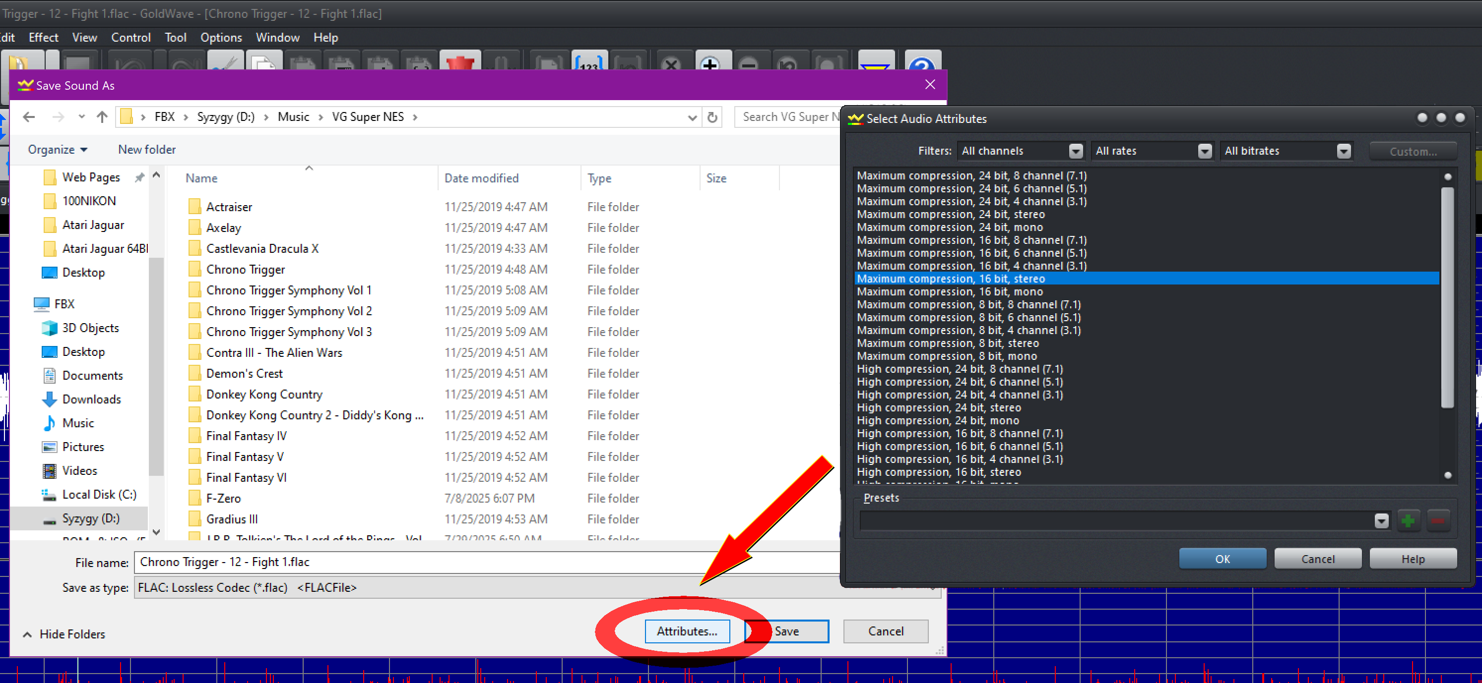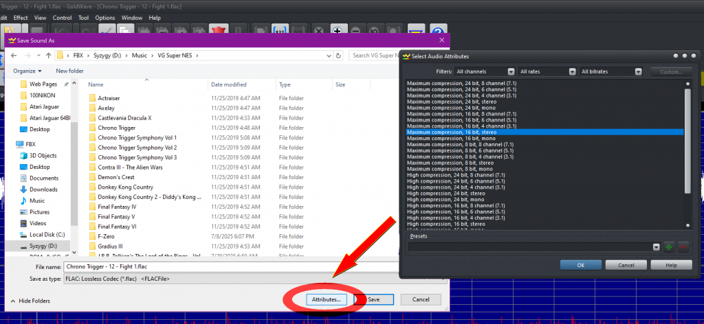The only thing to note, is FBX didn’t show the save process.  And while it’s really easy, I didn’t want to leave any margin for error, so I asked him to screenshot exactly how he saves.  Follow the process exactly as shown in the video, then go to File \ Save As.  Select which format you’d like to save it in from the drop-down menu; FLAC is recommended as shown here.  Then name the file and click the “Attributes” button.  FBX suggests: “Maximum Compression, 16-bit, Stereo”.  Then just hit “OK”, then “Save” and you’re all done!